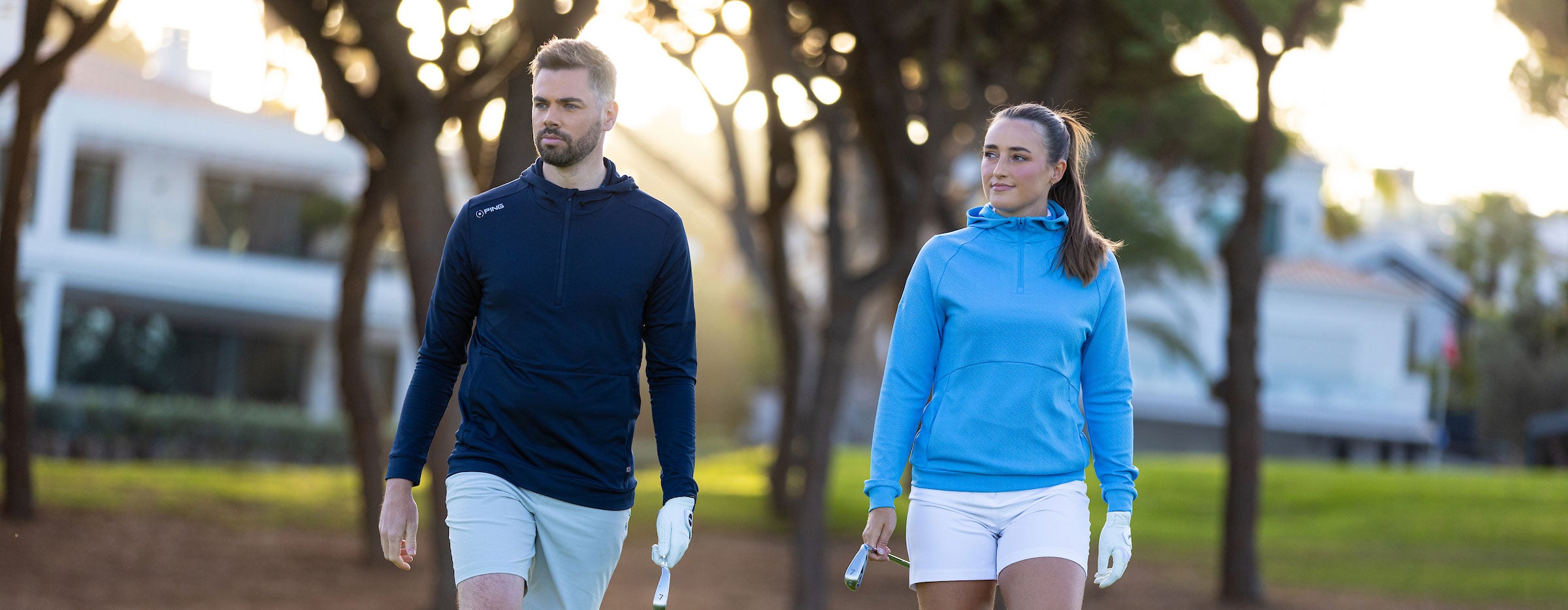 Our collection of men’s golf clothing and ladies golf clothing offers something for every season. Chino shorts and golf skorts that are perfect for staying cool in the summer, mid-layers to keep you warm in winter, and waterproofs that will come in handy all year round in the UK!