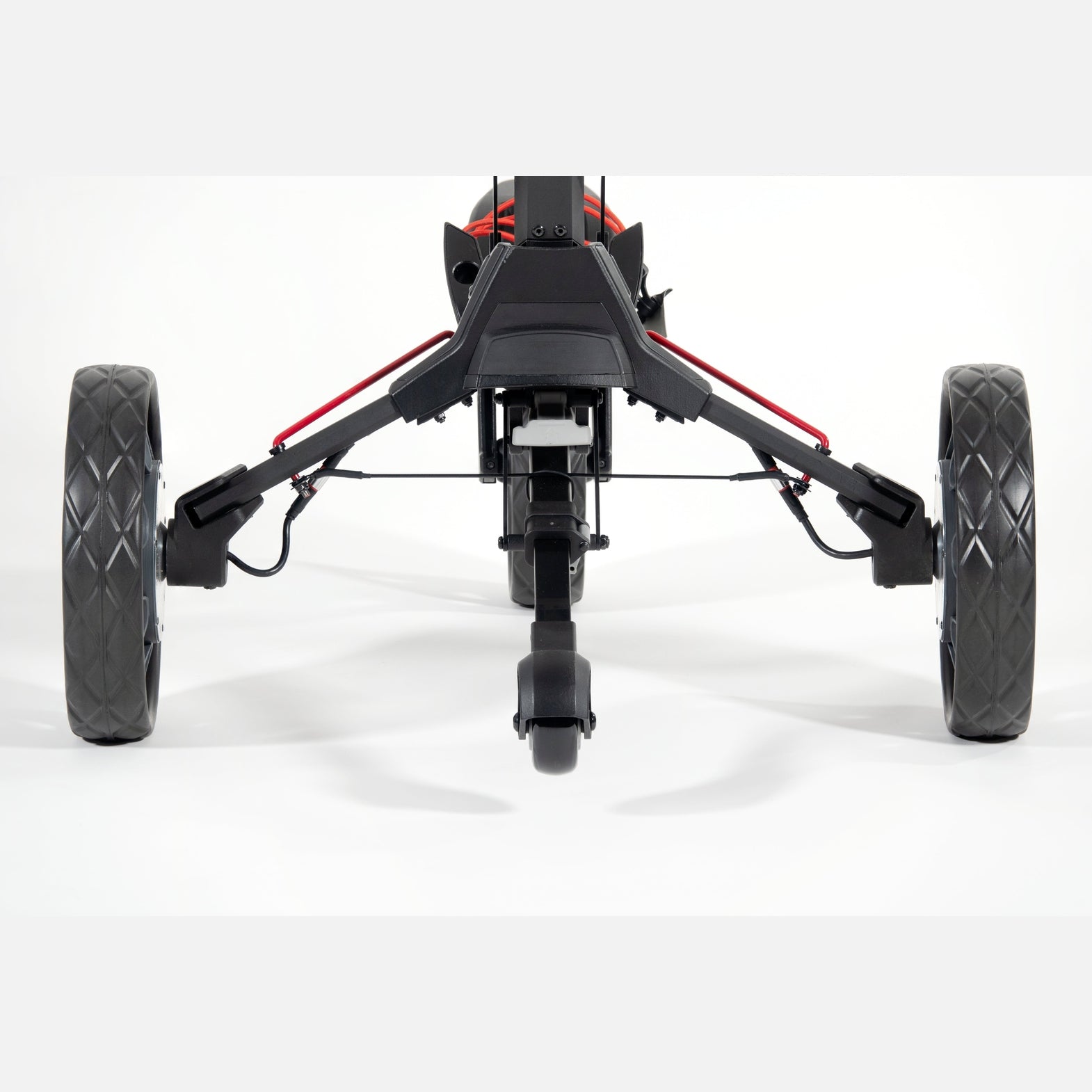 In the event of low battery, the wheels can be easily disengaged from the motor, allowing for manual pushing like a traditional cart. The Bagboy Volt is the ideal choice for golfers seeking a smart and lightweight remote control trolley with console storage.