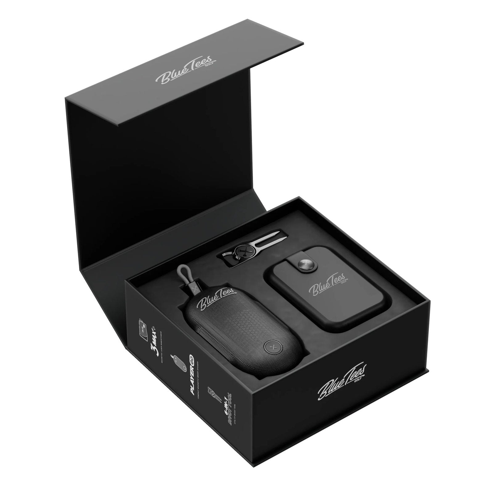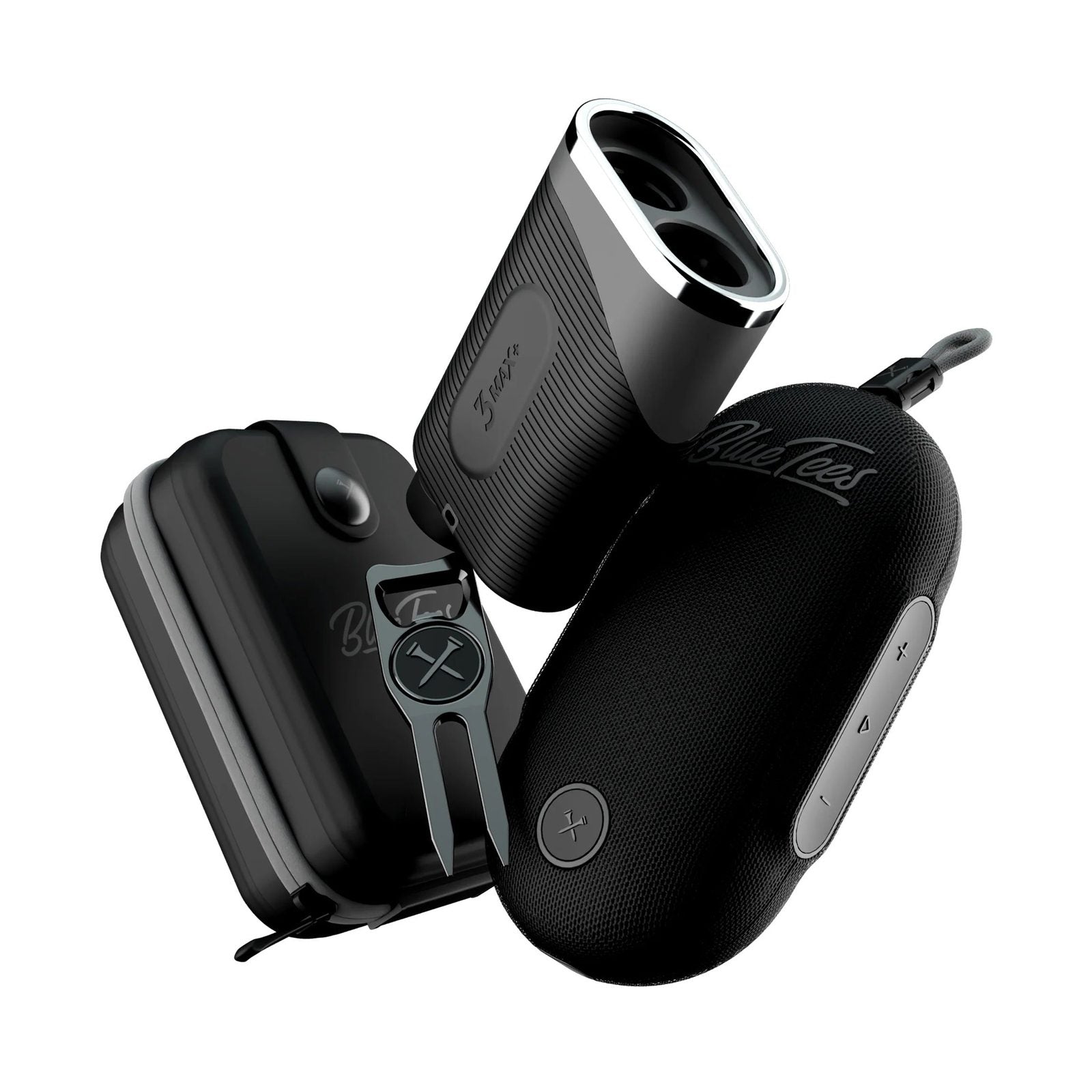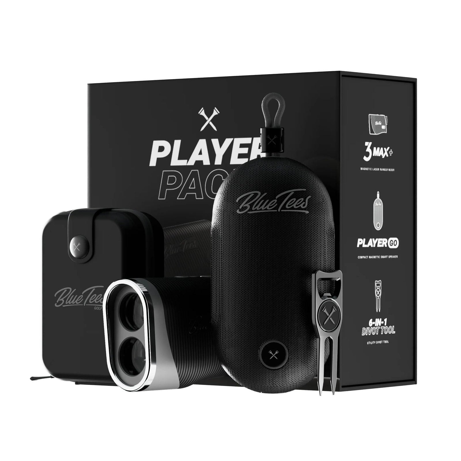Elevate your game with the Blue Tees Player Go Bundle BTB001. This ultimate bundle includes the Series 3 Max+ Laser Rangefinder, S3 Max+ case, Player GO GPS equipped Magnetic Speaker, and a premium 6-in-1 Utility Divot Tool. Get next generation technology for a more advanced golfing experience.