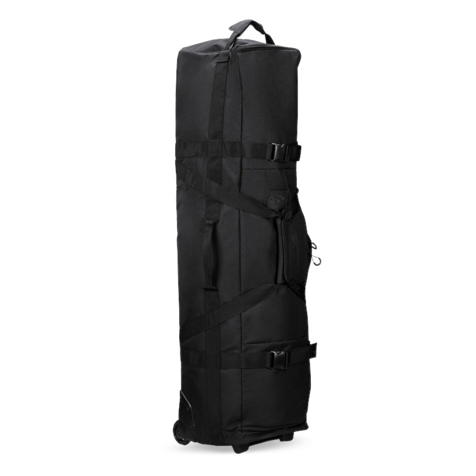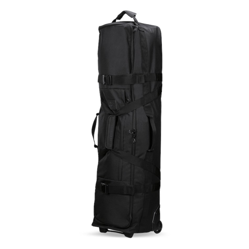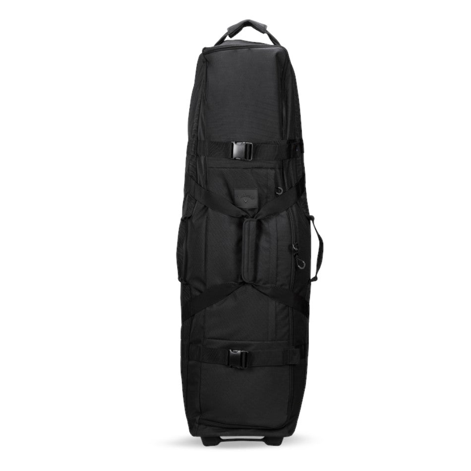 The Callaway Clubhouse Golf Travel Cover uses Repreve® Body Fabric, making it durable and environmentally friendly. Its Flip and Fold Compact Design allows for easy storage and transport, while the Comfort Grip Handle and reinforced wheel base provide comfort and stability. Keep your clubs secure with the Internal Slit Pockets and Exterior Quick Release Tie Downs. The included Driver Defender™ helps protect your valuable clubs during travel.