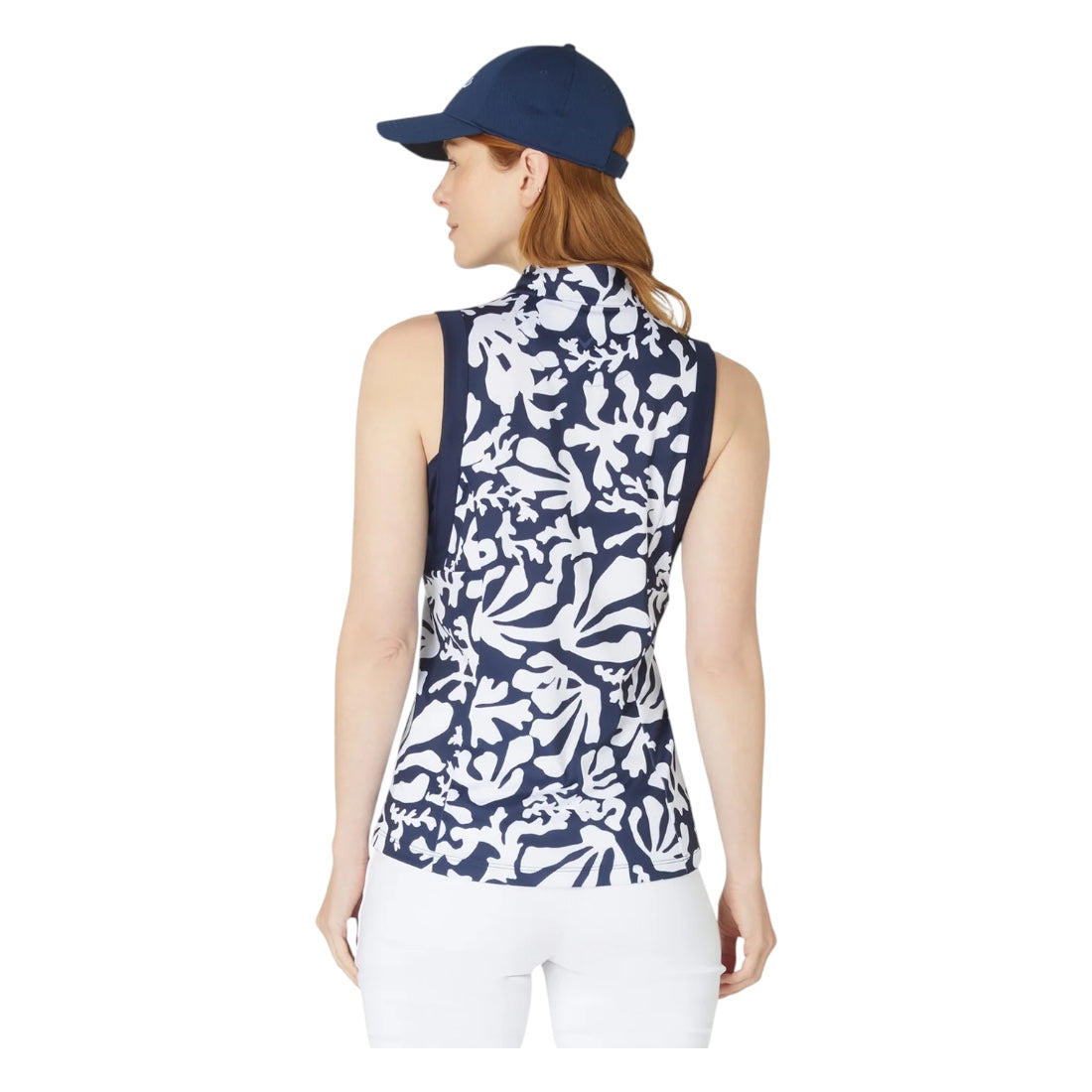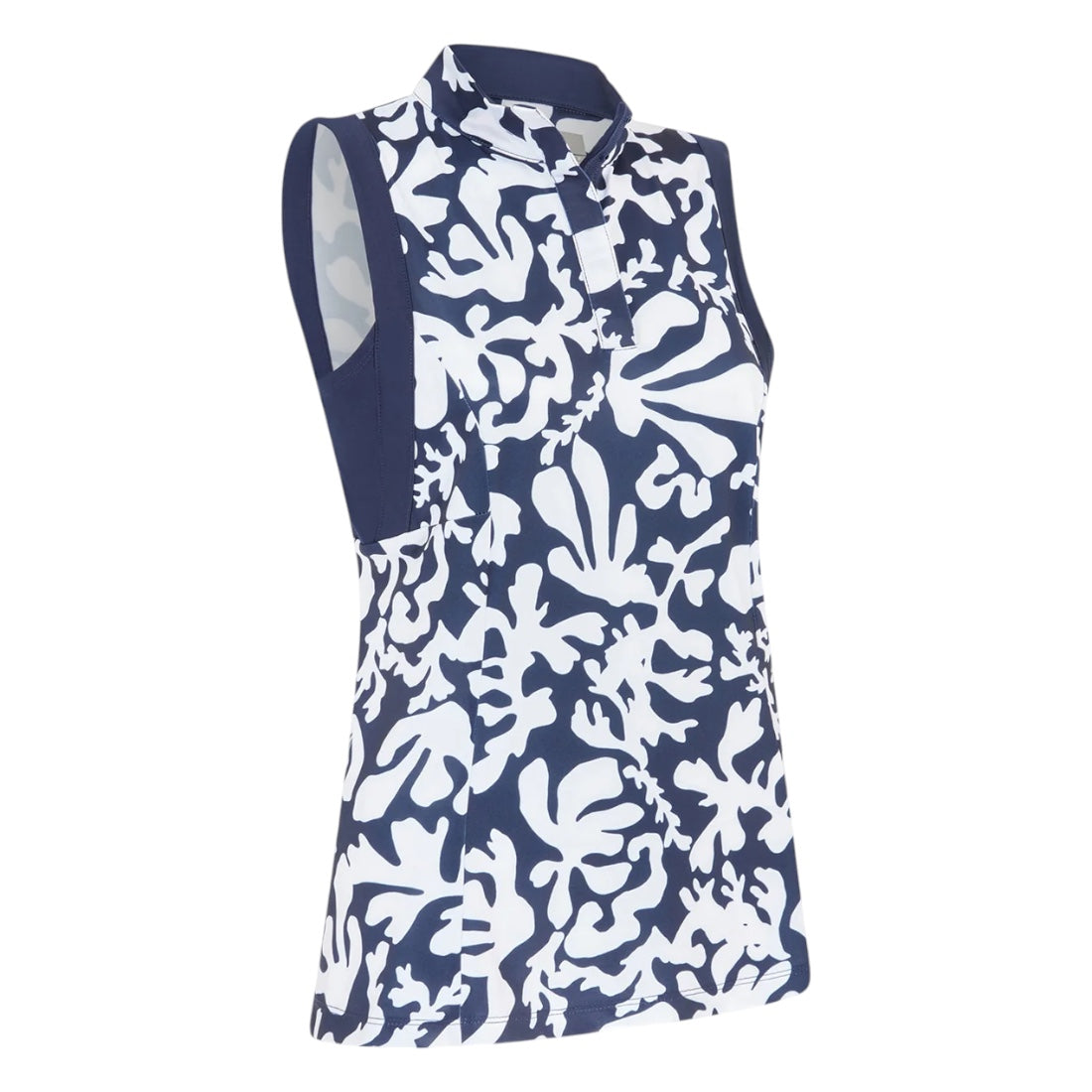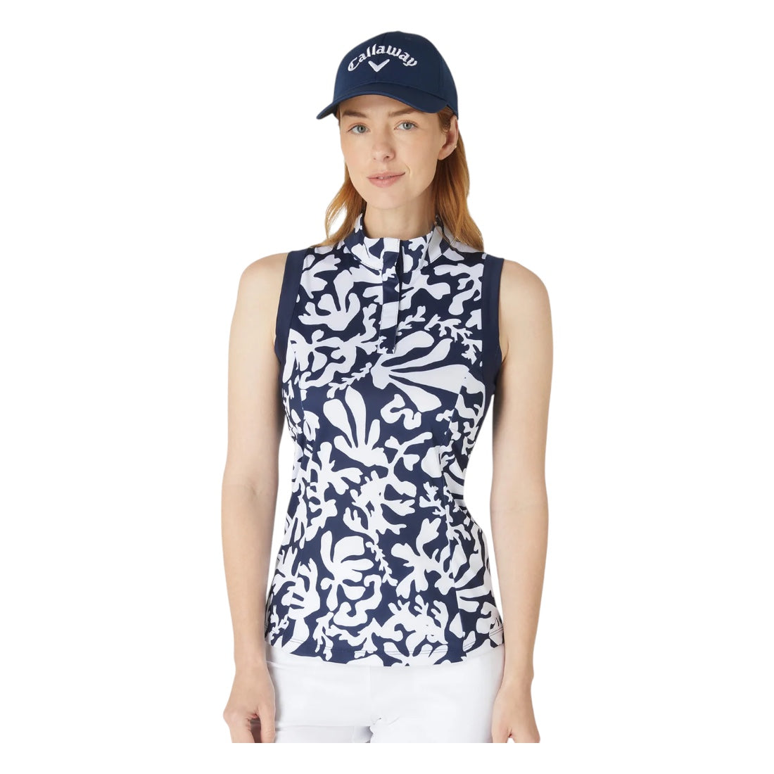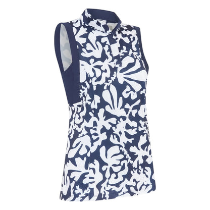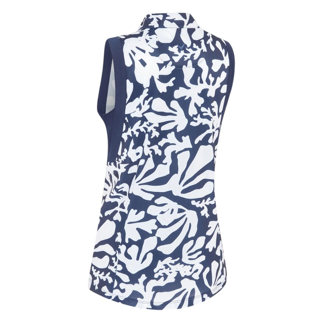 The Callaway Ladies Abstract Floral SL Golf Shirt features a stunning navy and white abstract floral print that is sure to turn heads on the golf course. Made with moisture wicking Opti-Dri fabric, this sleeveless polo keeps you cool and comfortable on the hottest days. The concealed popper placket and mini stand-up collar add a touch of sophistication to your game. Made with 95% recycled polyester, this shirt is both stylish and environmentally friendly.