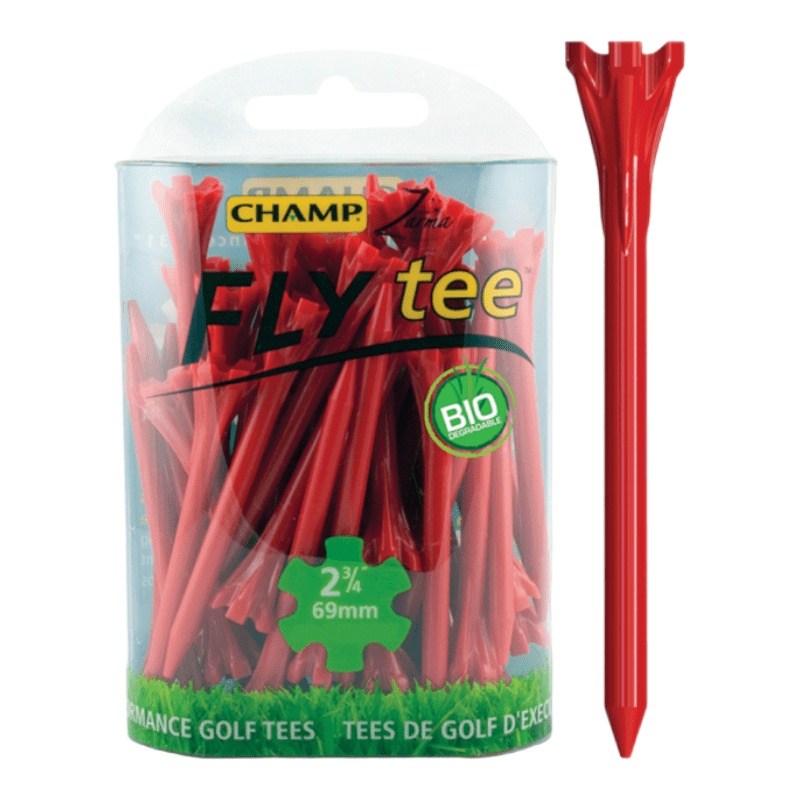 The Champ Zarma Fly Tees 2.75" (30 Pack) are performance tees that will help golfers up their game. Crafted with quality biodegradable materials, a 6-prong head for easy placement, and an impact-resistant rib, these tees are durable and designed to increase accuracy and maximize distance. Perfect for beginners and experts alike.