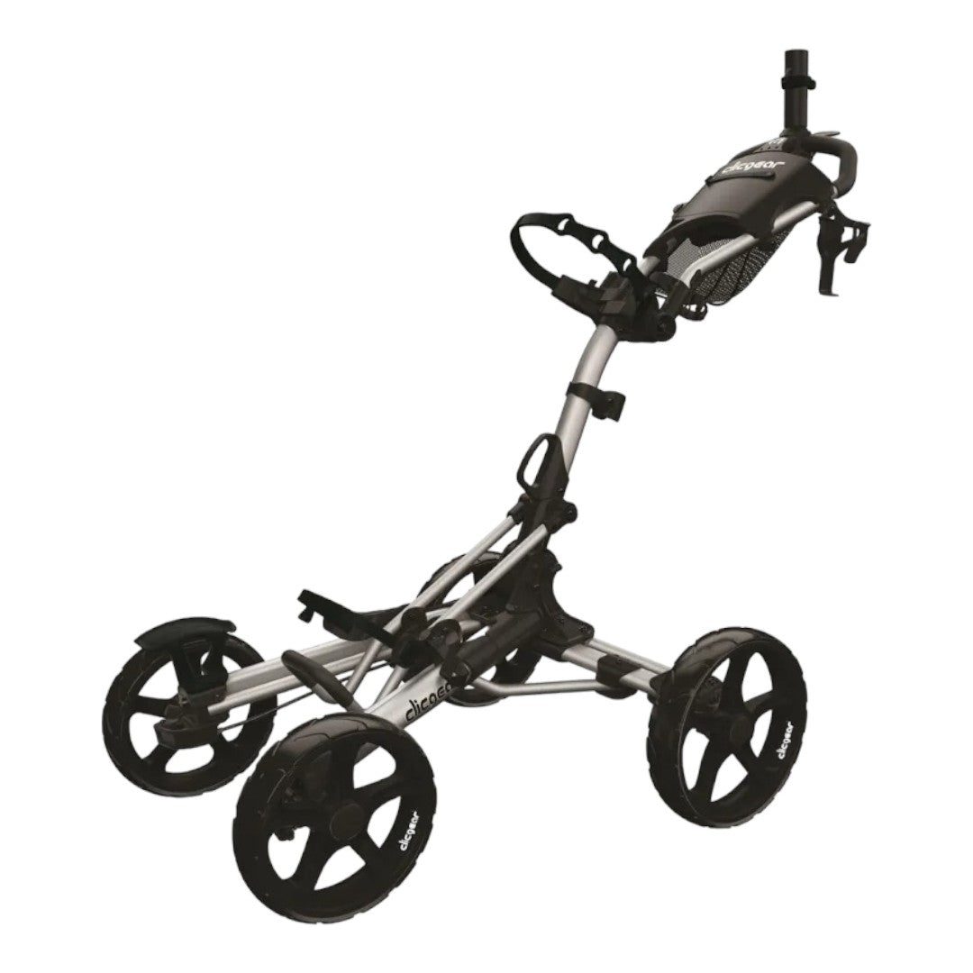 Discover the ultimate golf push trolley with the Clicgear Model 8.0+. Its patented 4 x FOLD folding system and folding front wheels result in an unparalleled open and closed footprint. The trolley also features new Silicone bag straps, an improved brake handle, and the option to customize with various coloured wheels and trim kits.