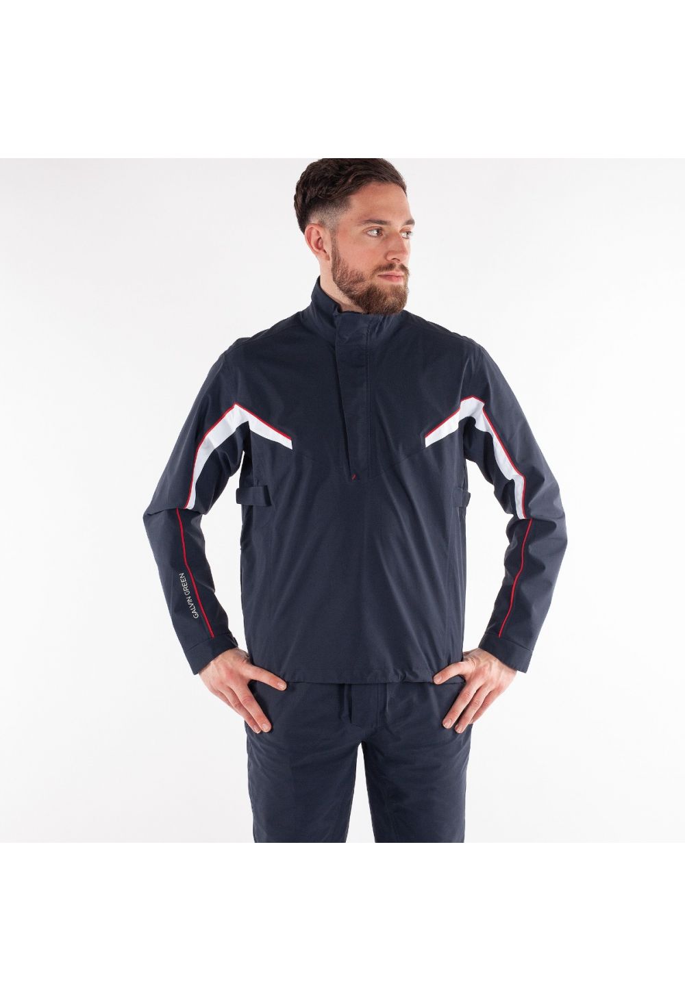 In navy with contrasting white and red detailing, the Galvin Green Abe 1/2-Zip Paclite Waterproof Golf Jacket offers style and comfort that is perfect for golf.
