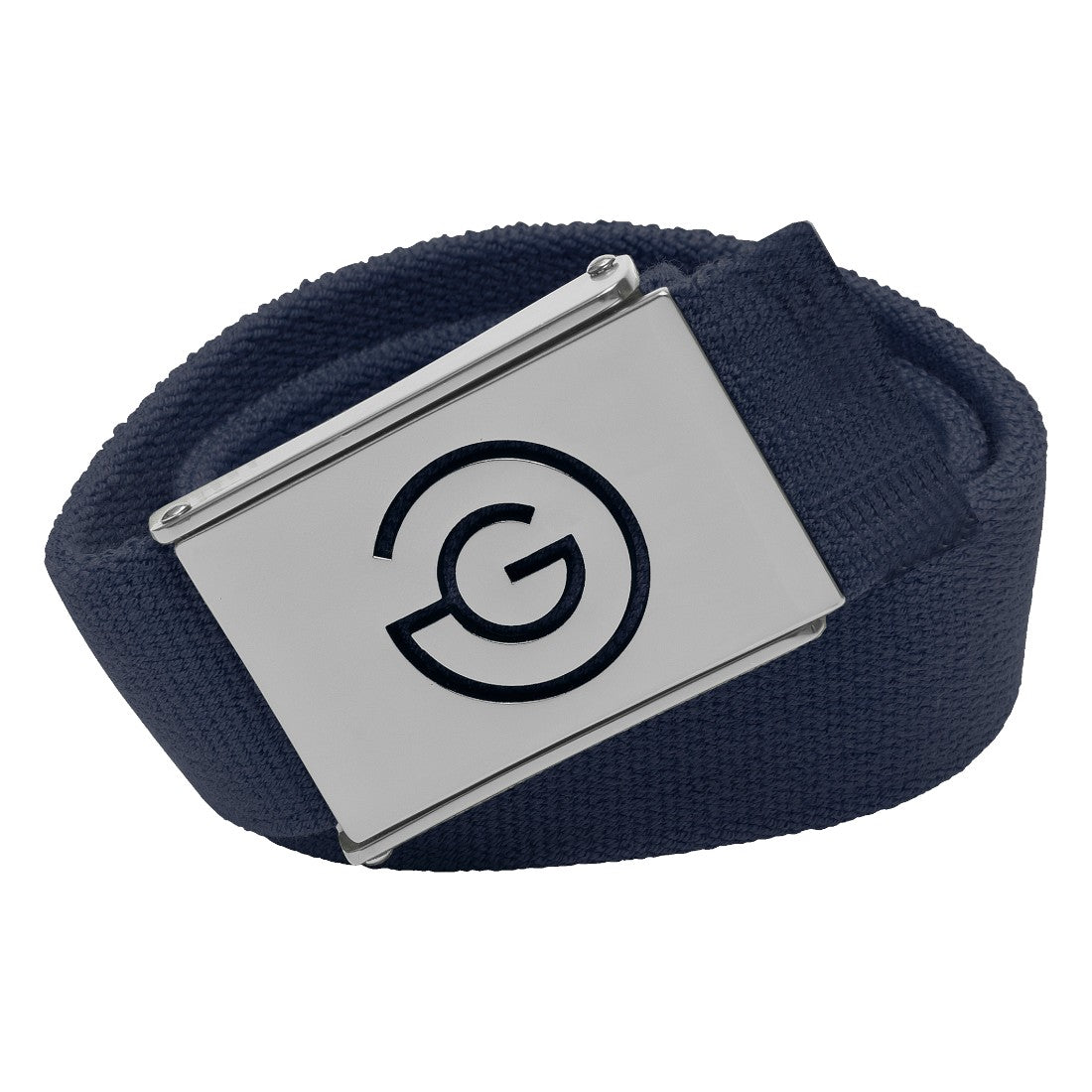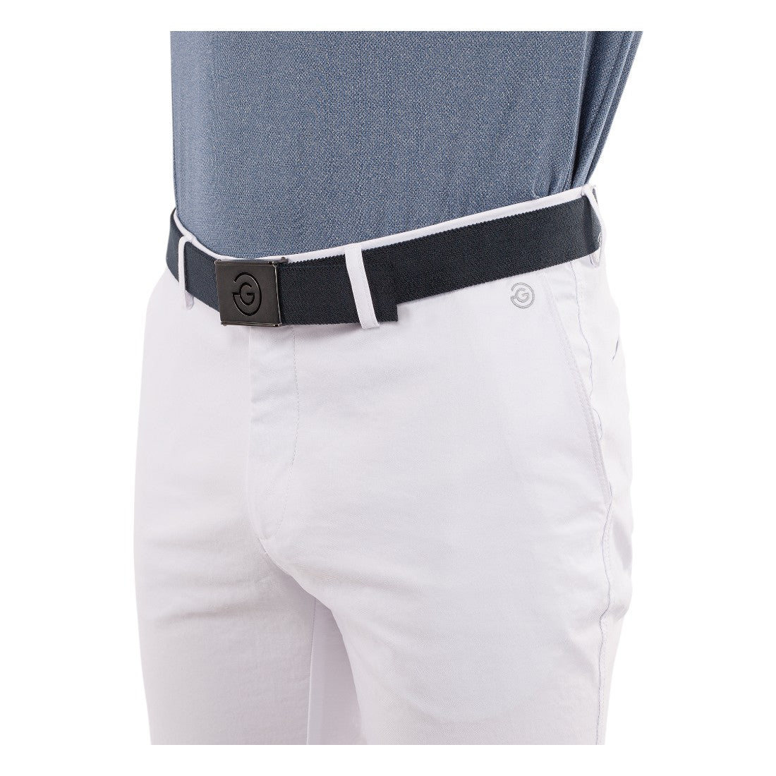 The Galvin Green Ward Elastic Golf Belt features a stretch design made of 95% recycled polyester and 5% spandex for adjustable, comfortable wear. The sustainable material is reinforced with a metal buckle, making it a durable and eco-friendly choice for golfers.