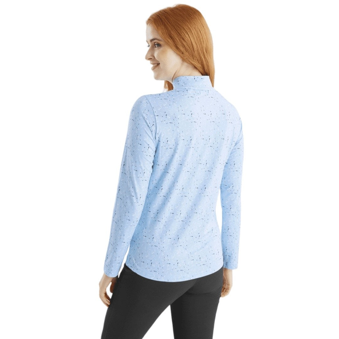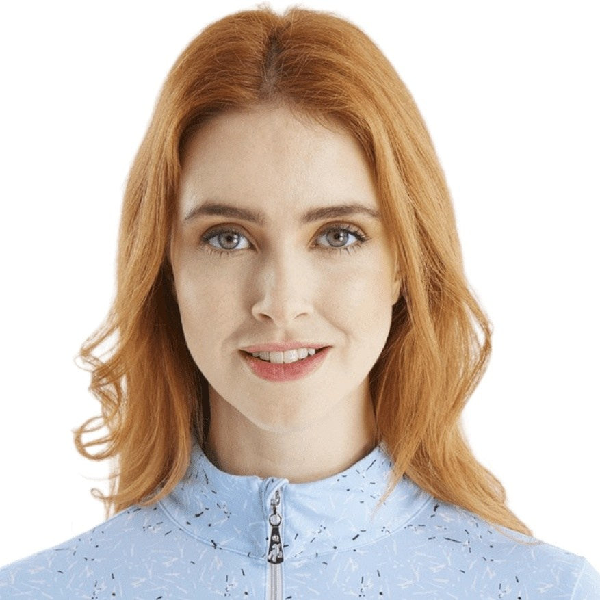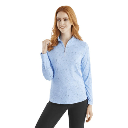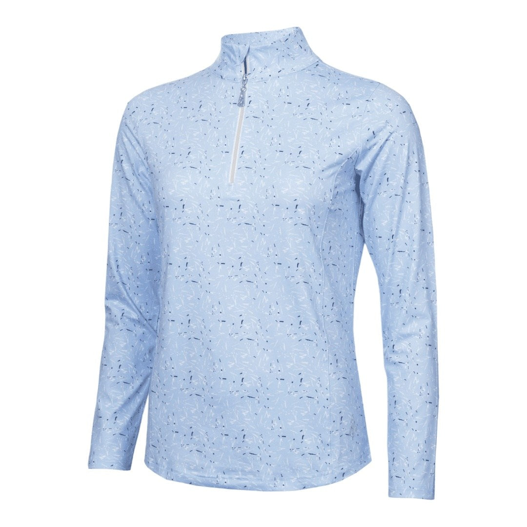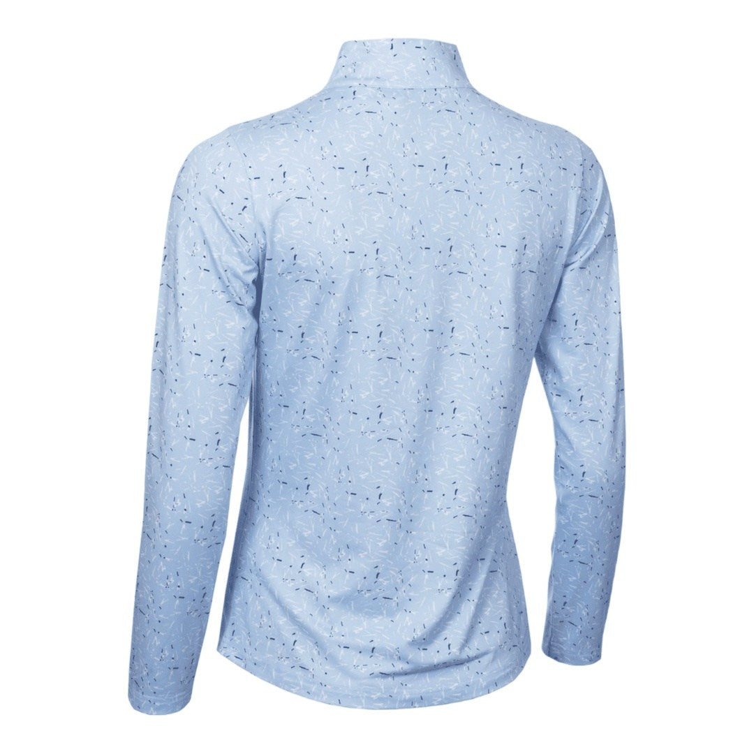 Elevate your game with the Green Lamb Ladies Keva Printed Zip Golf Top. In navy blue and featuring an all-over white stencil print, this 1/4 zip top is designed with ultra-soft performance tech fabric – lightweight, breathable and with moisture-wicking properties that keeps you cool and comfortable. Plus, it's made from 88% recycled materials. Take your golfing wardrobe to the next level.