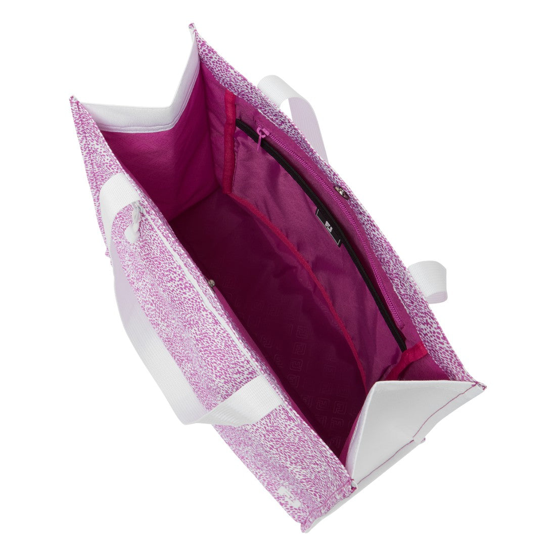 Carry your essentials in style with the Ladies Footjoy Tote Bag. With a popper fastening and multiple pockets, this bag is perfect for keeping your belongings organized and easily accessible. The 2 shoulder straps and flat standing base add convenience, while the animal print design and white logo give it a trendy look. Made from 100% polyester, it's durable and perfect for any occasion. Measures 14" wide and 13.5" high.