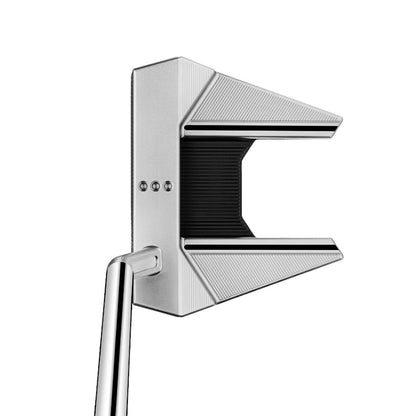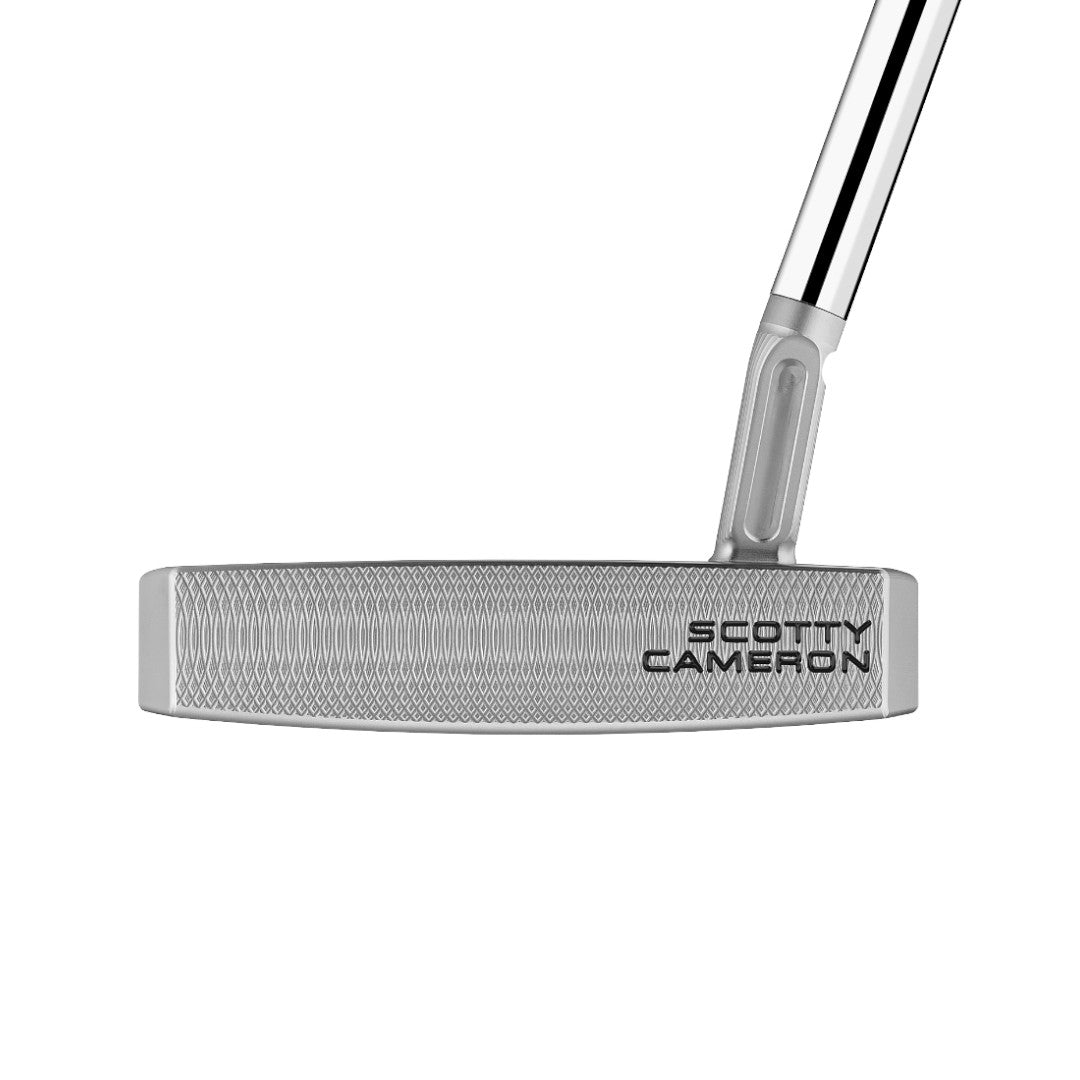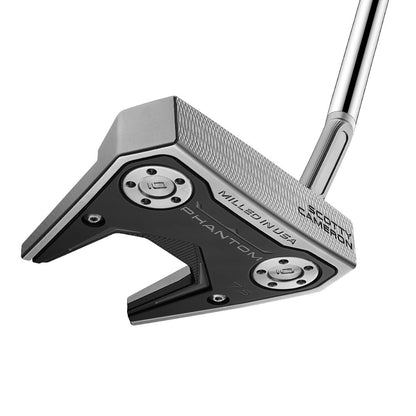 Scotty Cameron's Phantom 7.5 Golf Putter is designed for players who prefer long, rail-like alignment features in the flange with a hint of toe flow for an arcing putting stroke. This new model shares the same outline as the Phantom 7 for confident alignment and includes a jet neck to promote a smooth, stable stroke with high MOI. The addition of an elegant sight dot milling on the topline and elongated sight lines on the flange inspire confidence at address. Precision-milled 303 stainless steel and lightweight 6061 aircraft grade aluminum are used for perimeter weighting and a solid dual-milled face, with custom stainless steel sole weights and a full contact grip for optimal CG depth and MOI. This latest, Tour-inspired model is also available for left-handed players, with a stepless steel shaft.