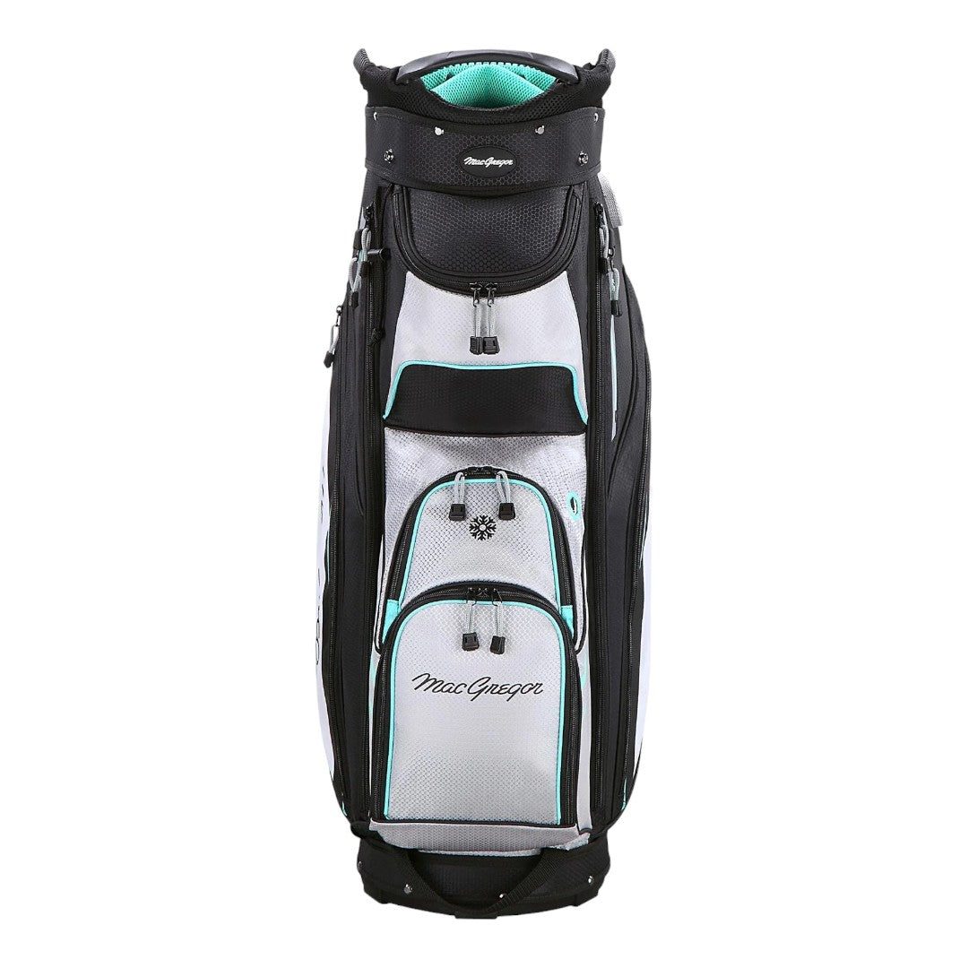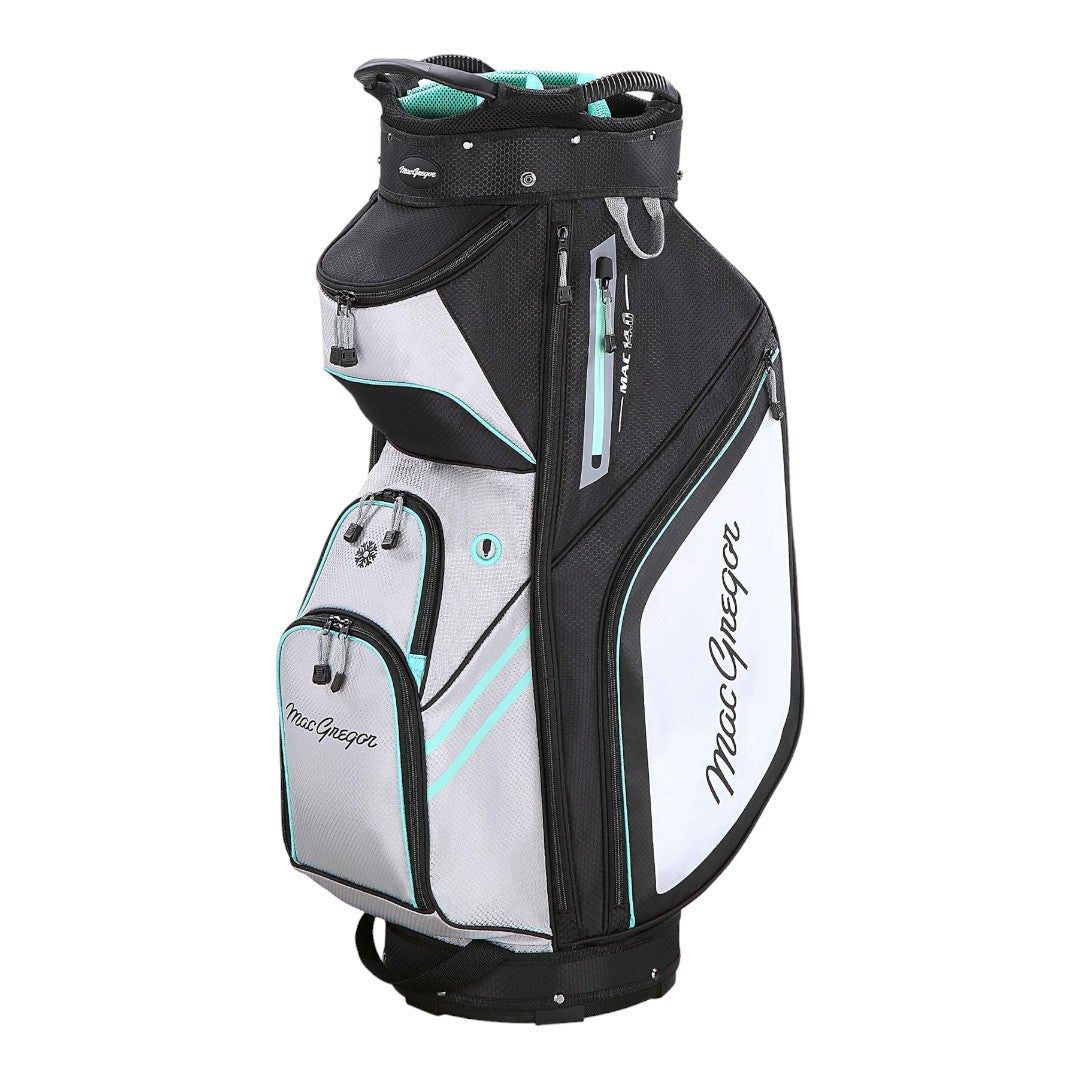 Carry your golf clubs in style with the MacGregor Principal 10" Cart Bag MACBAG158. Featuring a 10" top with 3 integrated handles, 14-way top with large putter divider, 9 strategically placed pockets, and more. Keep your accessories organized and within reach while on the course. Available in 4 stylish colours with the classic MacGregor logo.
