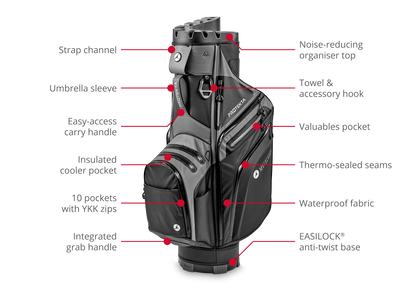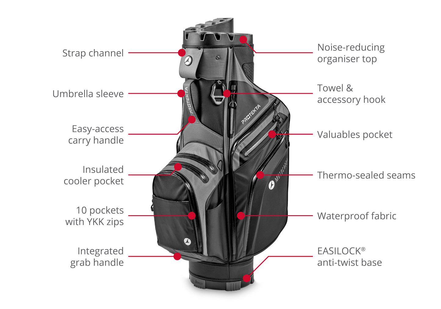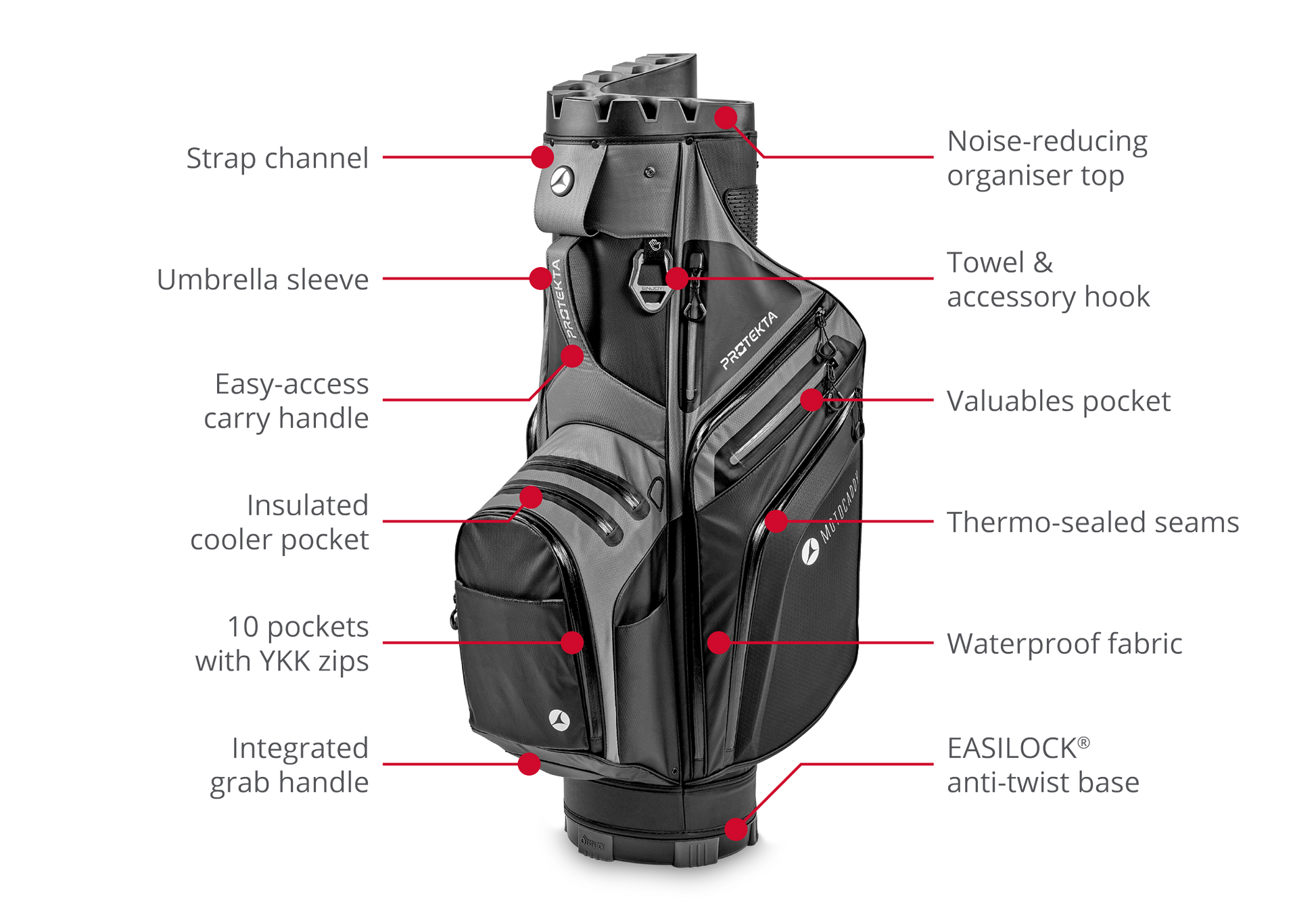 The Motocaddy 2025 Protekta Golf Cart Bag offers unparalleled convenience with a scorecard and pen holder, external umbrella sleeve, towel and accessory hook, and integrated bottle opener. The exclusive EASILOCK® system ensures a secure attachment to all Motocaddy trolleys, eliminating the need for a lower bag strap.