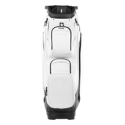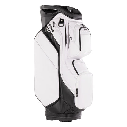 The Ping DLX 244 Golf Cart Bag 38095 offers versatile storage with various pocket sizes, including space for range finders, beverages, and apparel. Its soft, durable vinyl leather and rubberized, cross-design bottom ensure secure and easy transport on motorized and pull carts.