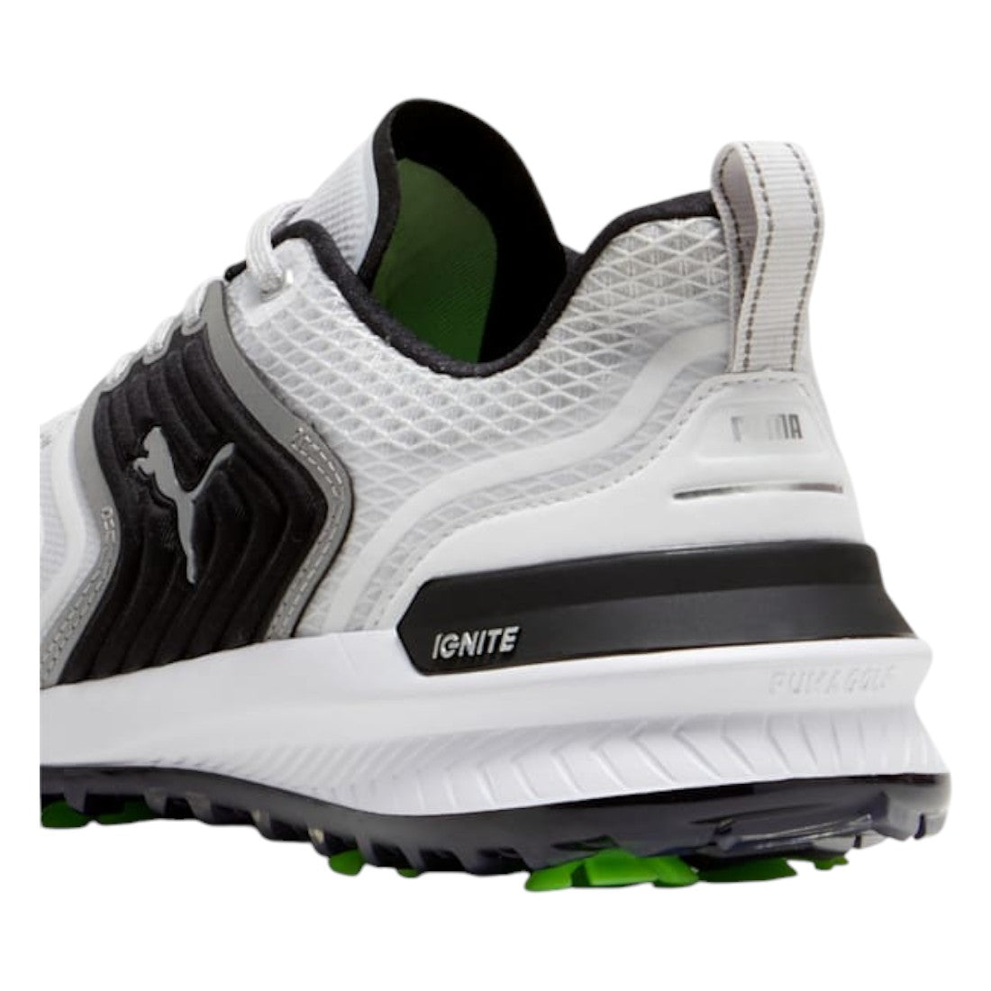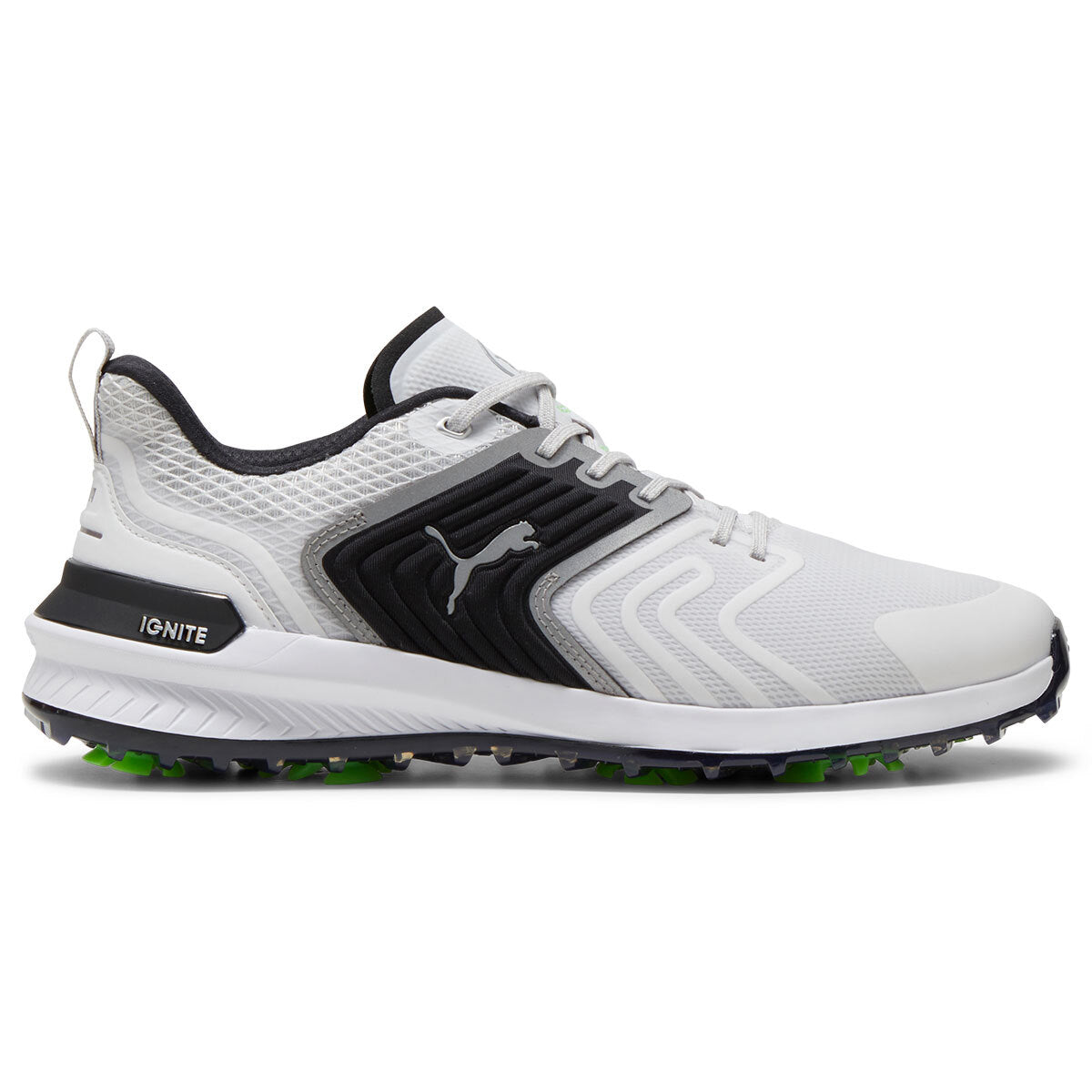 Experience revolutionary comfort and support on the golf course with the Puma Ignite Innovate Golf Shoes. Featuring IGNITEFOAM technology, these Puma golf shoes provide energy return and responsive comfort. With the EXOSHELL upper and PWRTAPE reinforcement, your feet stay dry and stable during swings. The anatomically shaped last and performance saddle ensure a consistent, comfortable fit. Featuring 7-cleat traction pattern and FLEXSPIKE technology for 72 unique grip points, it also has 54 secondary traction elements for swing traction and walking comfort. Its strategically placed toe-cleat ensures grip throughout your entire swing. FLEXSPIKE is the first spiked outsole designed to leave minimal marks on greens.