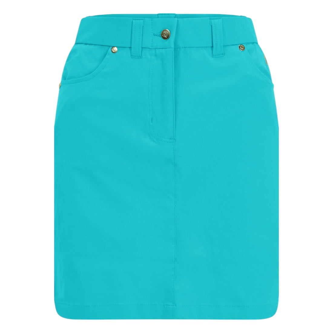 The Pure Golf Ladies Calm Golf Skort is the perfect blend of comfort and style. Made with a four-way stretch polyester fabric, it ensures a solid feel and is quick-drying. The small slit at the back and silver studs give it an elegant touch. Complete your look with matching undershorts.