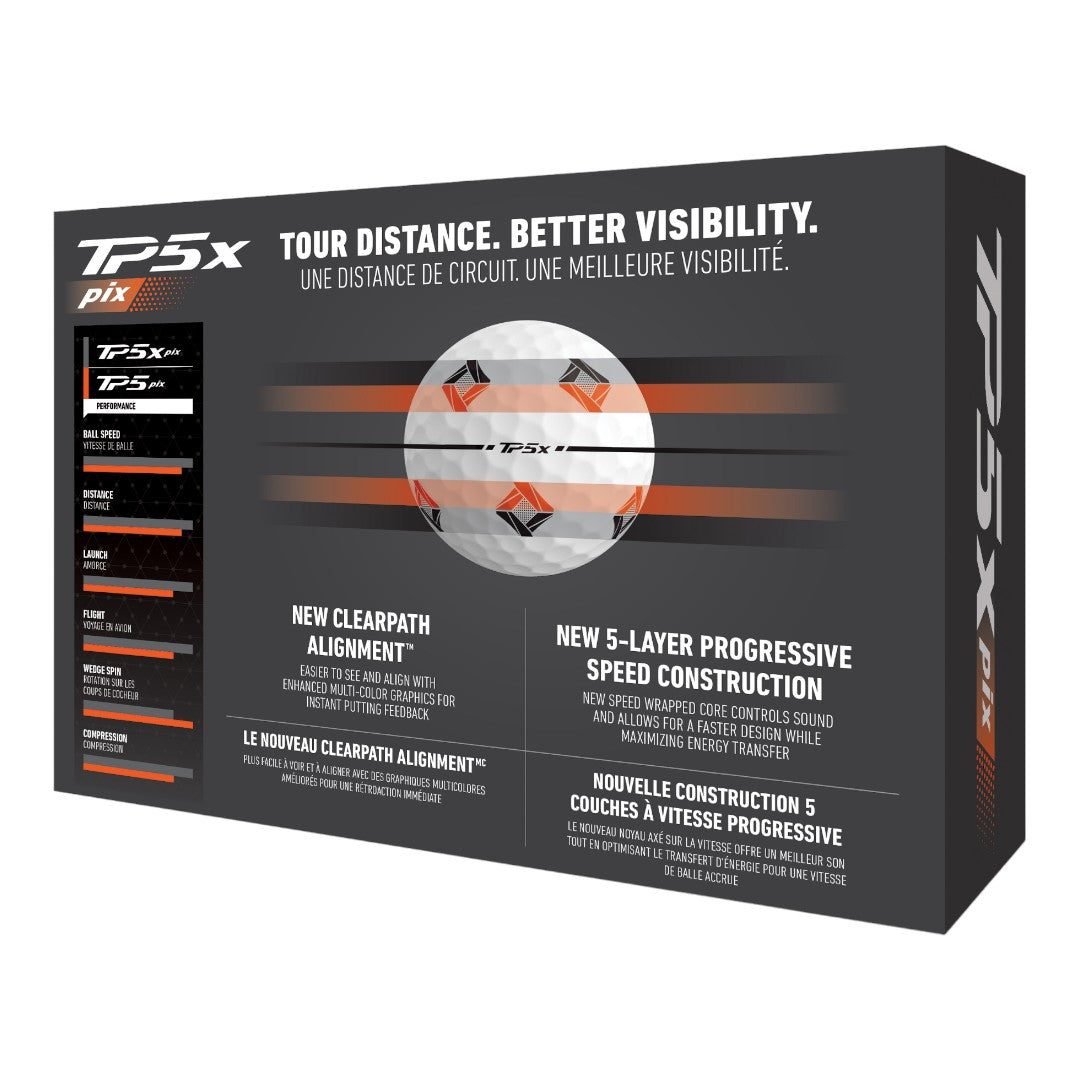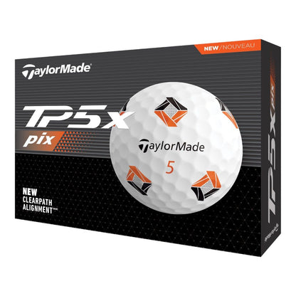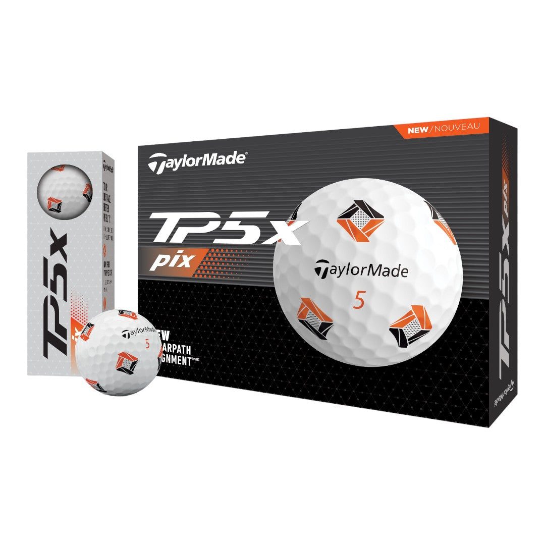 The TaylorMade TP5x Pix Golf Balls offer increased ball speeds and a larger speed gradient optimized for spin separation between clubs with enhanced durability. The Pix design patterns provide superior alignment & visibility on the greens.