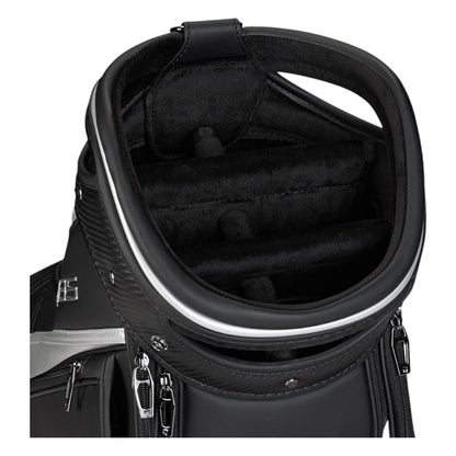 Experience the ultimate tour-level golf bag with the TaylorMade 2025 Tour Staff Bag. Boasting 12 pockets, including quick access magnetic closure and hard shell stash pockets, this bag ensures all your essentials are within reach. The hard shell hex side mould and carbon fibre channel provide a durable and stylish look. Elevate your golf game with this professional quality bag.