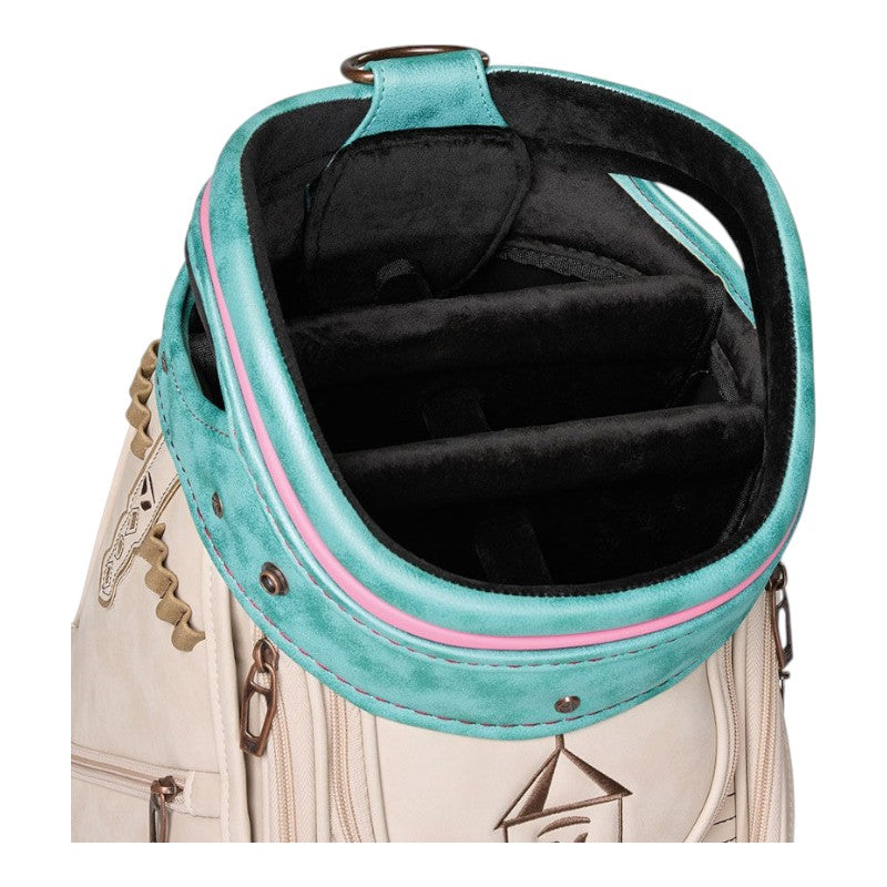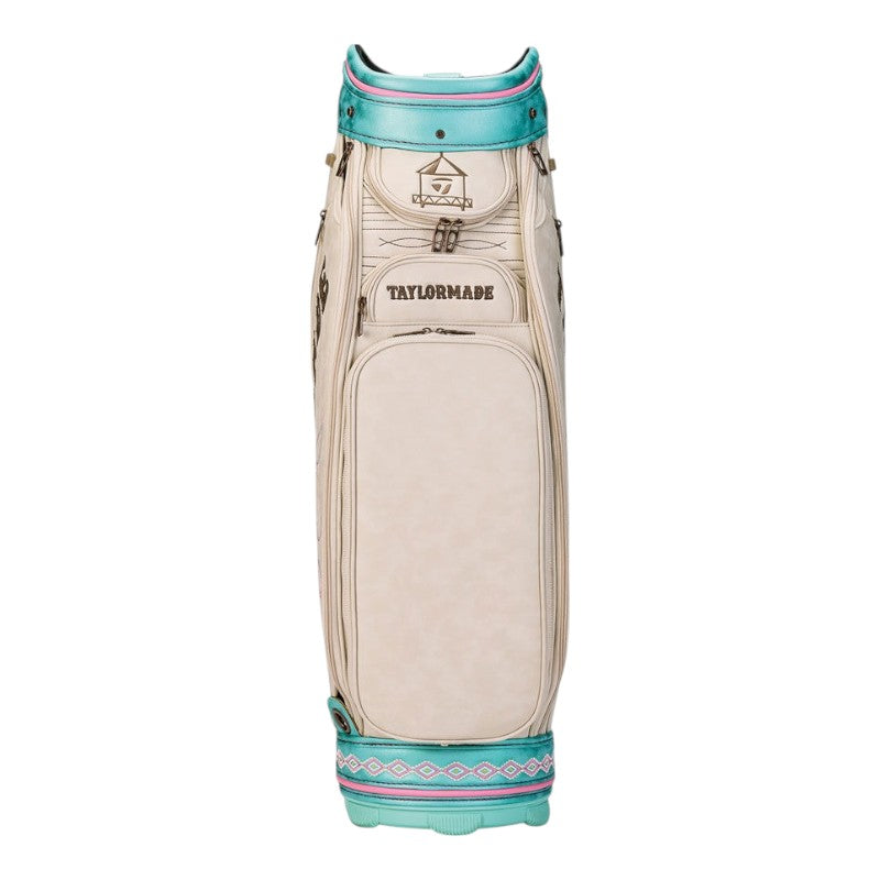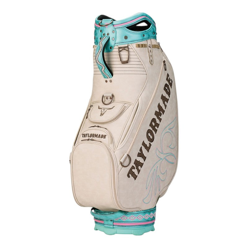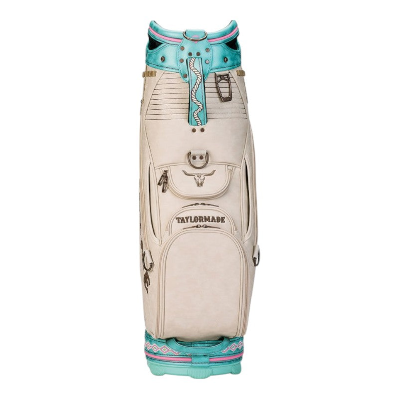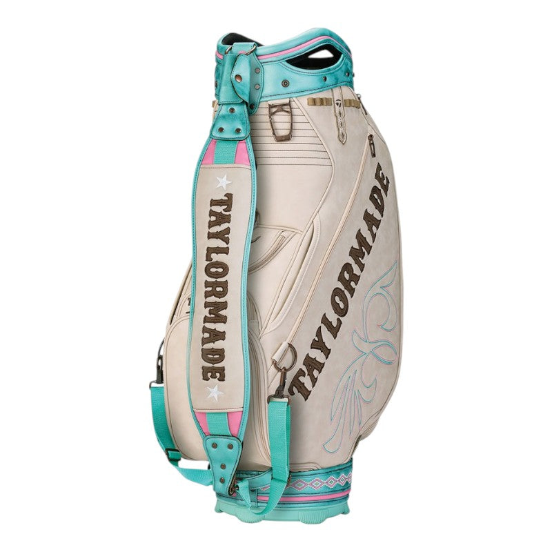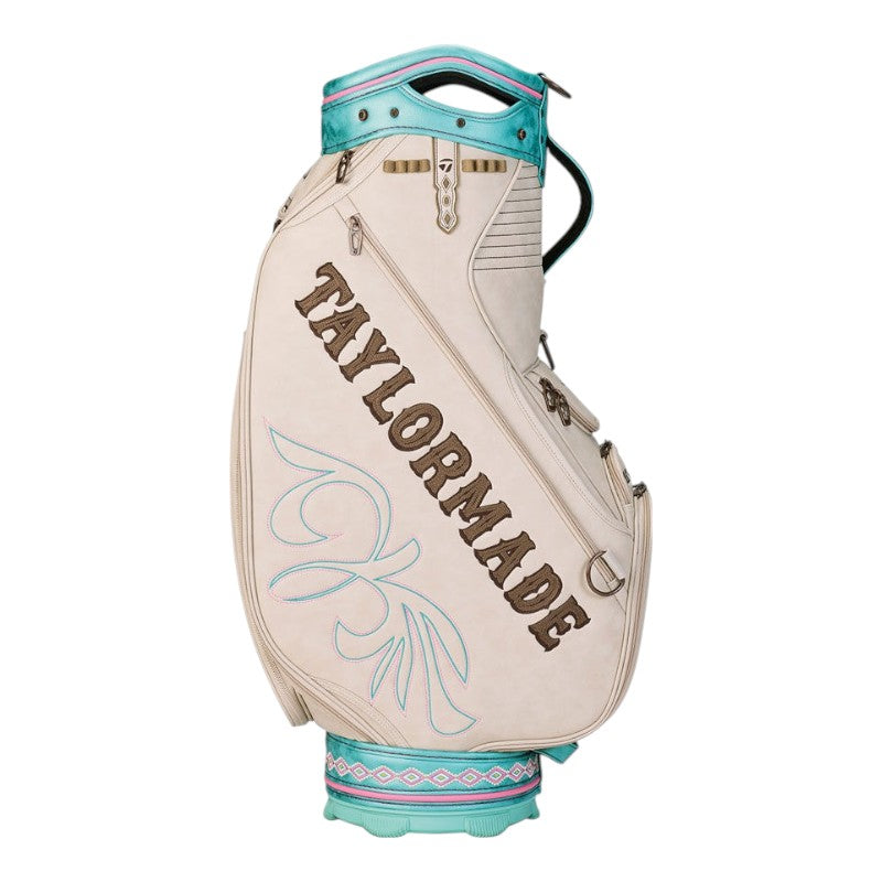 The TaylorMade Ladies PGA Championship Stockyard Staff Bag draws inspiration from the rich heritage of Frisco’s cowboy and cowgirl traditions. Featuring a refined design influenced by cowgirl boots, its beige, turquoise, brown, and pink color scheme subtly reflects Western culture. Detailed stitching mirrors expert boot craftsmanship, while exterior tee holders shaped like bullet holsters add a distinctive, adventurous touch. This staff bag combines style and functionality, honoring the spirit of the frontier with premium materials and thoughtful design elements tailored for the discerning golfer.