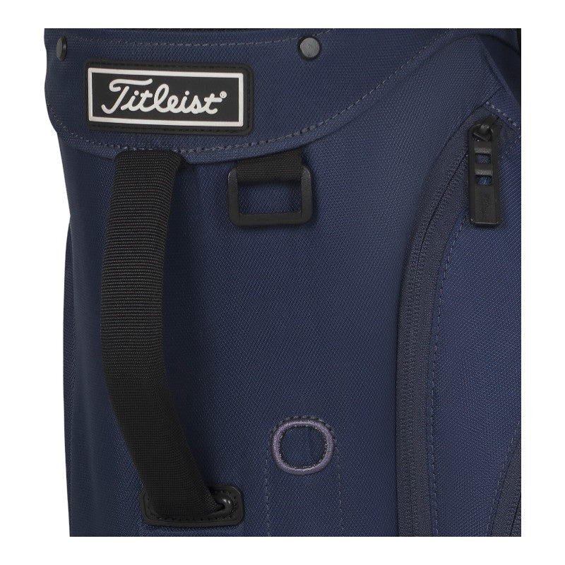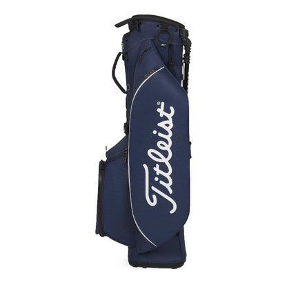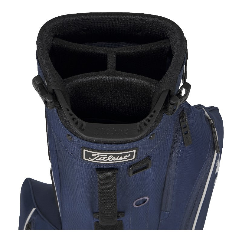 Its navy body with white accents includes a premium double strap for comfortable carrying, an easy-access horseshoe tee pocket, and a full-length apparel pocket with curved zippers for quick reach. Additional features like a lined external drink sleeve and high-quality YKK zippers ensure durability and convenience on the course.